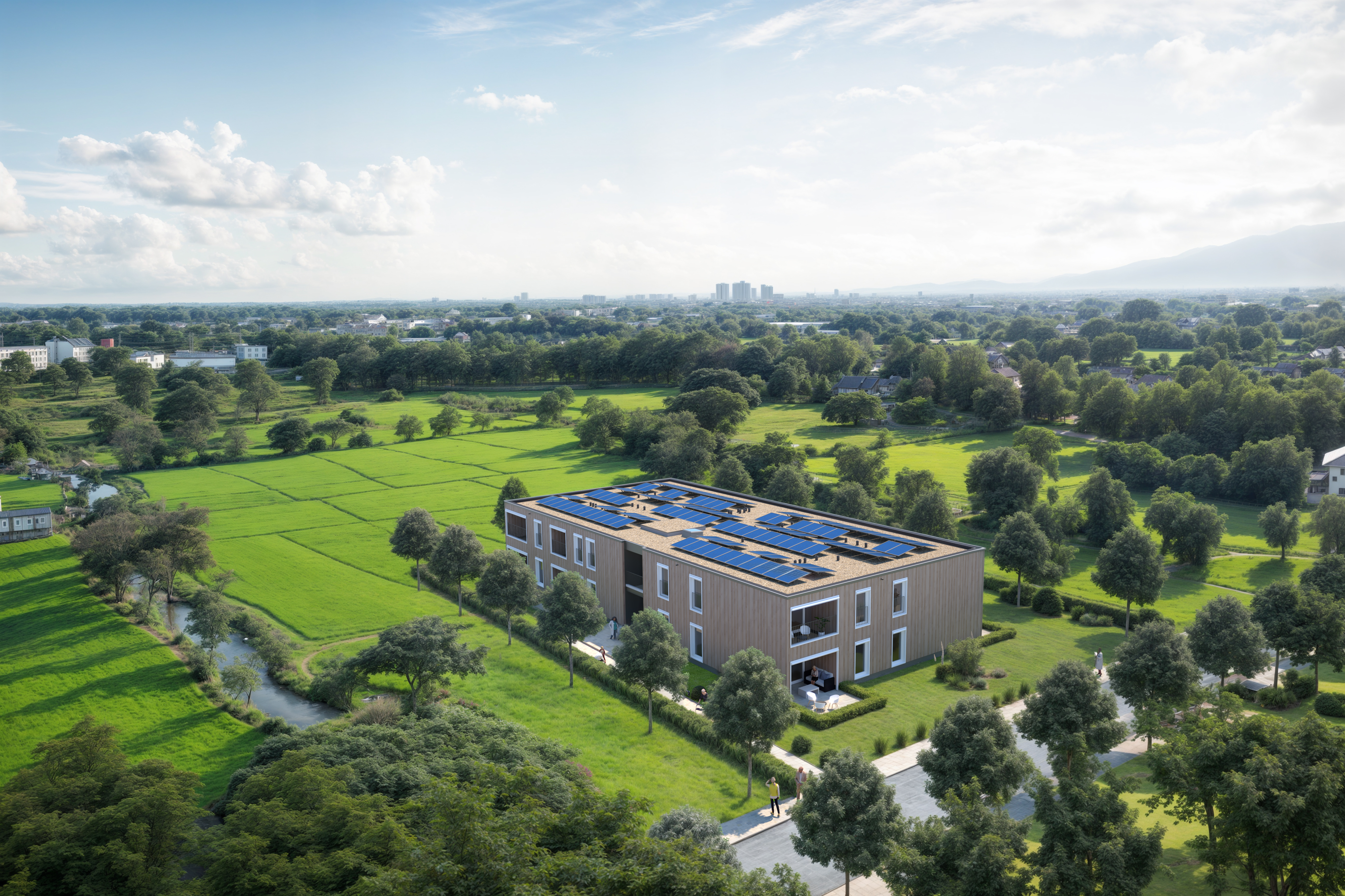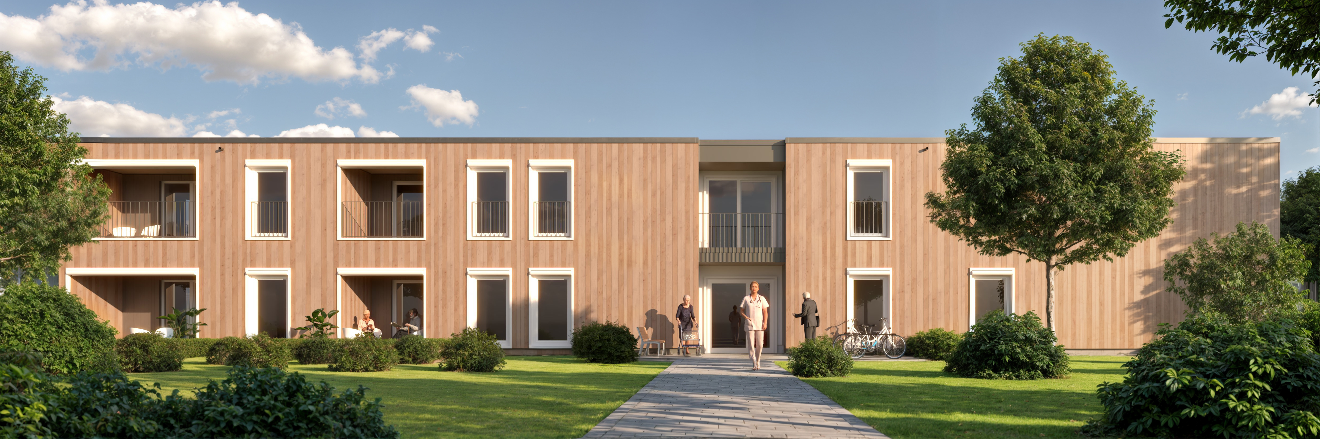 Auf einem modernen Pflegecampus werden 16 barrierefreie Wohnungen im Betreuten Wohnen im Landhaus-Stil realisiert, die ein wohnliches Ambiente mit hoher Funktionalität vereinen. Die Gebäude werden in energieeffizienter KfW-40-QNG-Bauweise und moderner Holzmodultechnik erstellt und erreichen damit einen hohen Nachhaltigkeitsstandard, der über die DGNB-Zertifizierung dokumentiert wird. Großzügige, lichtdurchflutete Räume, schwellenarme Zugänge und durchdachte Grundrisse fördern Komfort und Selbstständigkeit der Bewohner.